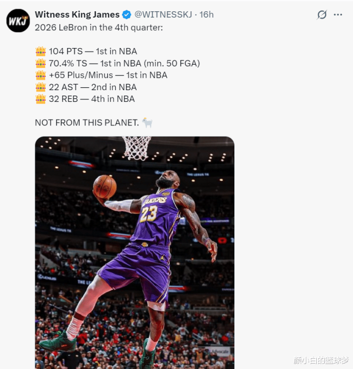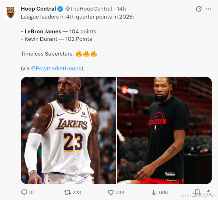 在湖人拒绝公牛逆转的赛后,美媒晒出进入2026年后,勒布朗末节104分联盟第一,杜兰特末节102分联盟第二,勒布朗41岁高龄,杜兰特37岁高龄,时光一晃眼过去了10多年,可詹杜双皇依旧炸裂。