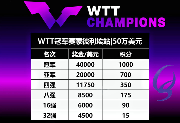 蒙彼利埃冠军赛,是WTT第三档赛事,设置了50万美元的总奖金。冠军奖金4万美元,亚军奖金2万美元,四强奖金11750美元,八强奖金8500美元,16强奖金6000美元,32强奖金4500美元。