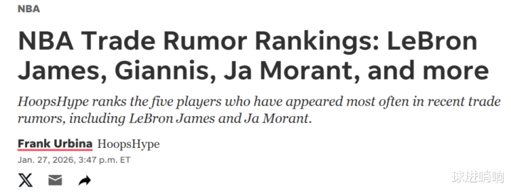 詹姆斯入选!美媒《hoopshype》更新公布出过去一周交易市场中热门大鱼TOP5名单,其中4人与勇士队息息相关。