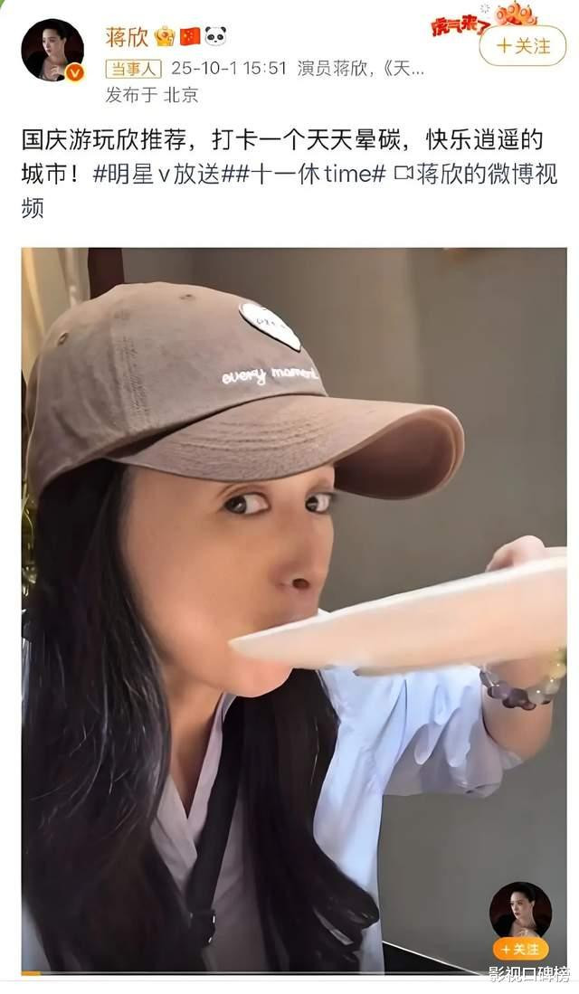 10月1日,女演员蒋欣在其社交平台发布了国庆假期游西安的爽吃VLOG。视频里她将身材管理抛至脑后,狂炫烧烤,羊肉泡馍,biangbiang面,甑糕等碳水美食。自嘲道“一天吃一顿,一顿吃一天”,同时还一边吃一边立着减肥flag:“菜叶子明天再说”,给人一种命苦的反差感。部分网友表示:没想到蒋欣私底下还是个“大馋丫头”,硬是将罕见的放纵餐吃出了专业吃播的感觉。
