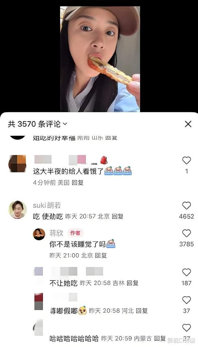 如今这么敞开肚皮吃,经纪人若是知晓必然会崩溃的。恰好经纪人在线冲浪,亲自空降评论区鼓励蒋欣:“吃,使劲吃。”看似风平浪静的四个字,实则是没招了。不过该回复的字里行间都透露着一股阴阳怪气的危机感,足以预见经过这次酣畅淋漓的爽吃后,蒋欣后续又要面对很久的健身房和减脂餐大礼包了。就蒋欣经纪人崩溃的反应延伸出了大众对于健康审美的讨论。