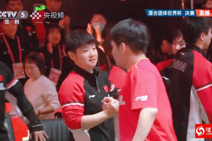 王曼昱:“心情是非常激动的,今天团体决赛,我们每一位上场球员都发挥得非常出色。然后每一次的团体赛,我相信大家都能感受到中国力量,中国乒乓球队的力量”。