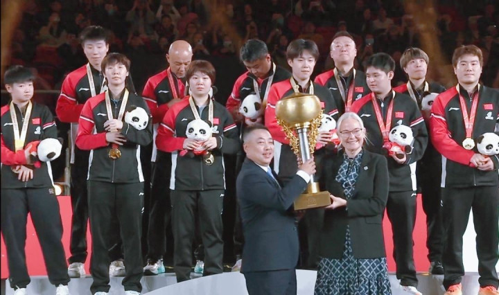 热烈祝贺中国乒乓球队,连续三届获得混合团体世界杯的冠军 。