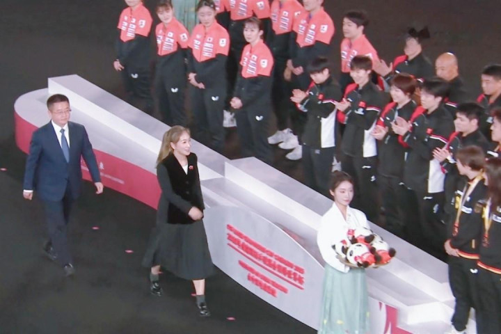 国际乒联运动员委员会主席刘诗雯,为铜牌得主德国队,颁发吉祥物娃娃。